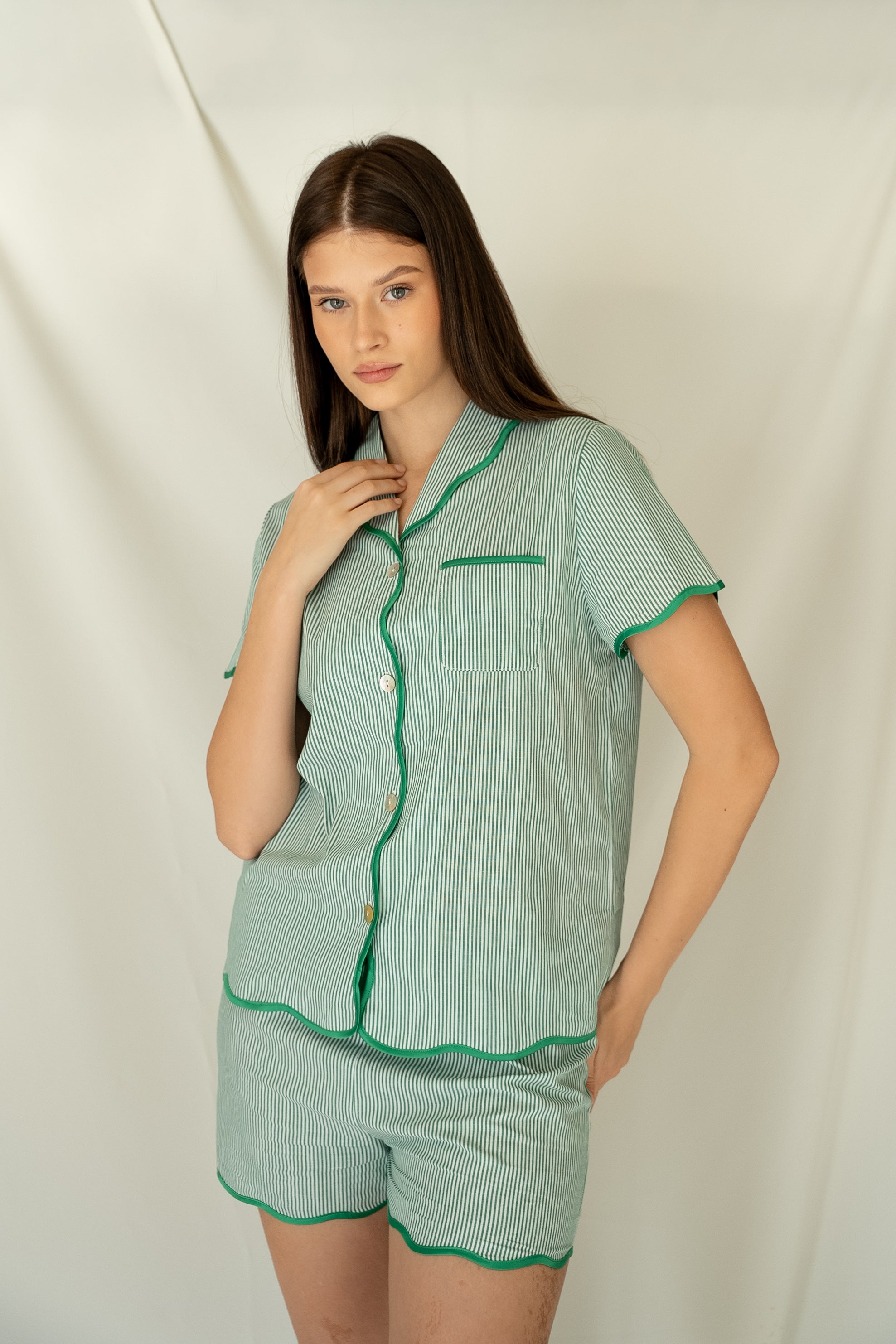 Nightsuit blends playful design with considered details: Breathable cotton poplin, delicate scalloped piping, and smooth mother-of-pearl buttons. Our sleepwear moves seamlessly from bed to breakfast and precious moments of stillness.